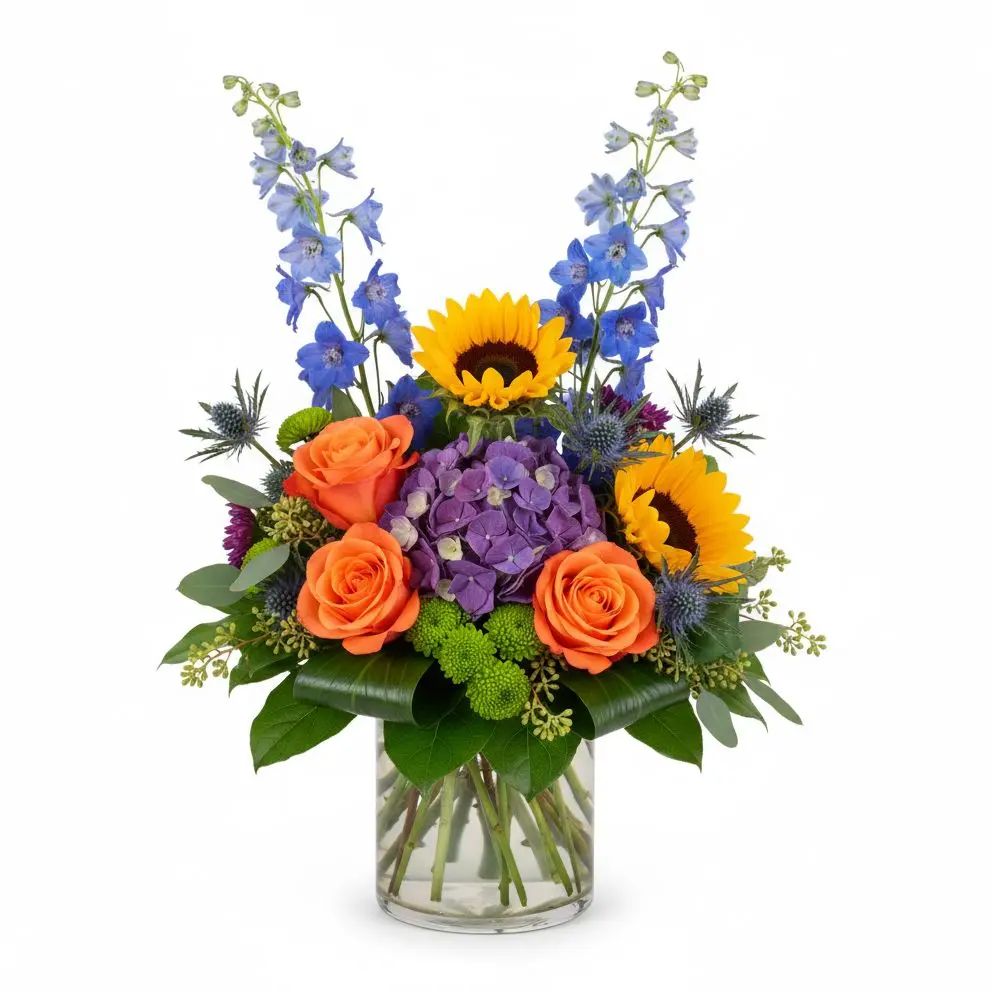 Brighten any day with the 'Blue Sky & Sunshine', a vibrant mix designed to bring pure joy and warmth. Featuring radiant sunflowers, delicate roses, and majestic blue delphinium, this arrangement evokes feelings of clear skies and golden sunshine. It's the perfect way to send a burst of happiness to someone special.