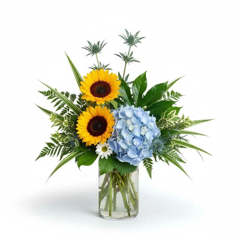 Experience the radiant joy of our Azure Sunburst arrangement, a breathtaking blend of sunny sunflowers and serene blue hydrangeas. This stunning floral masterpiece brings the warmth of a bright day and the calm of the sky into any space. Elevate your mood and celebrate life's moments with this vibrant display of nature's beauty.